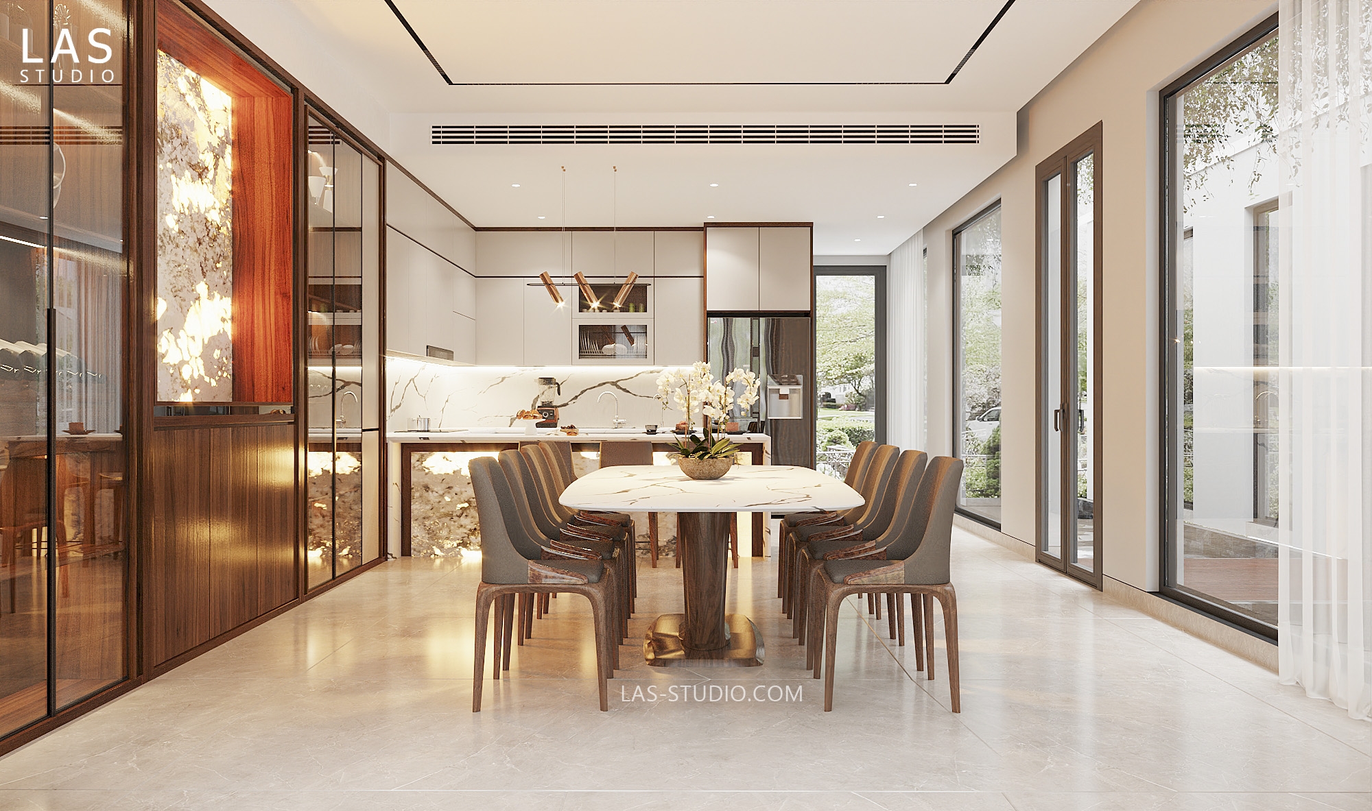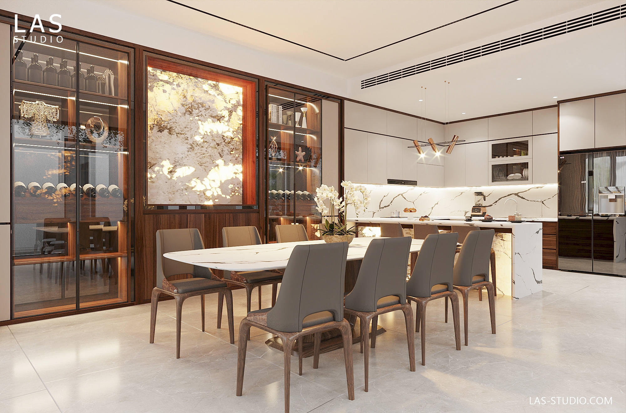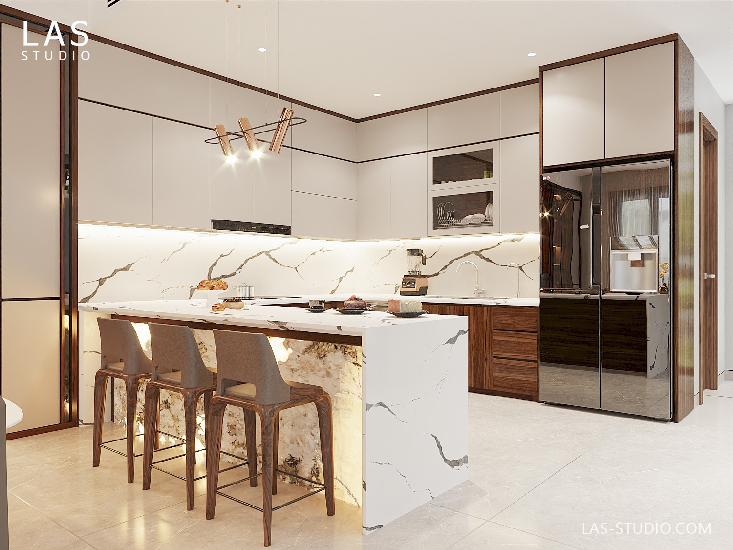 Nhà bếp: Tủ bếp gỗ óc chó không chỉ bền bỉ mà còn giúp không gian bếp trở nên sang trọng, hiện đại.