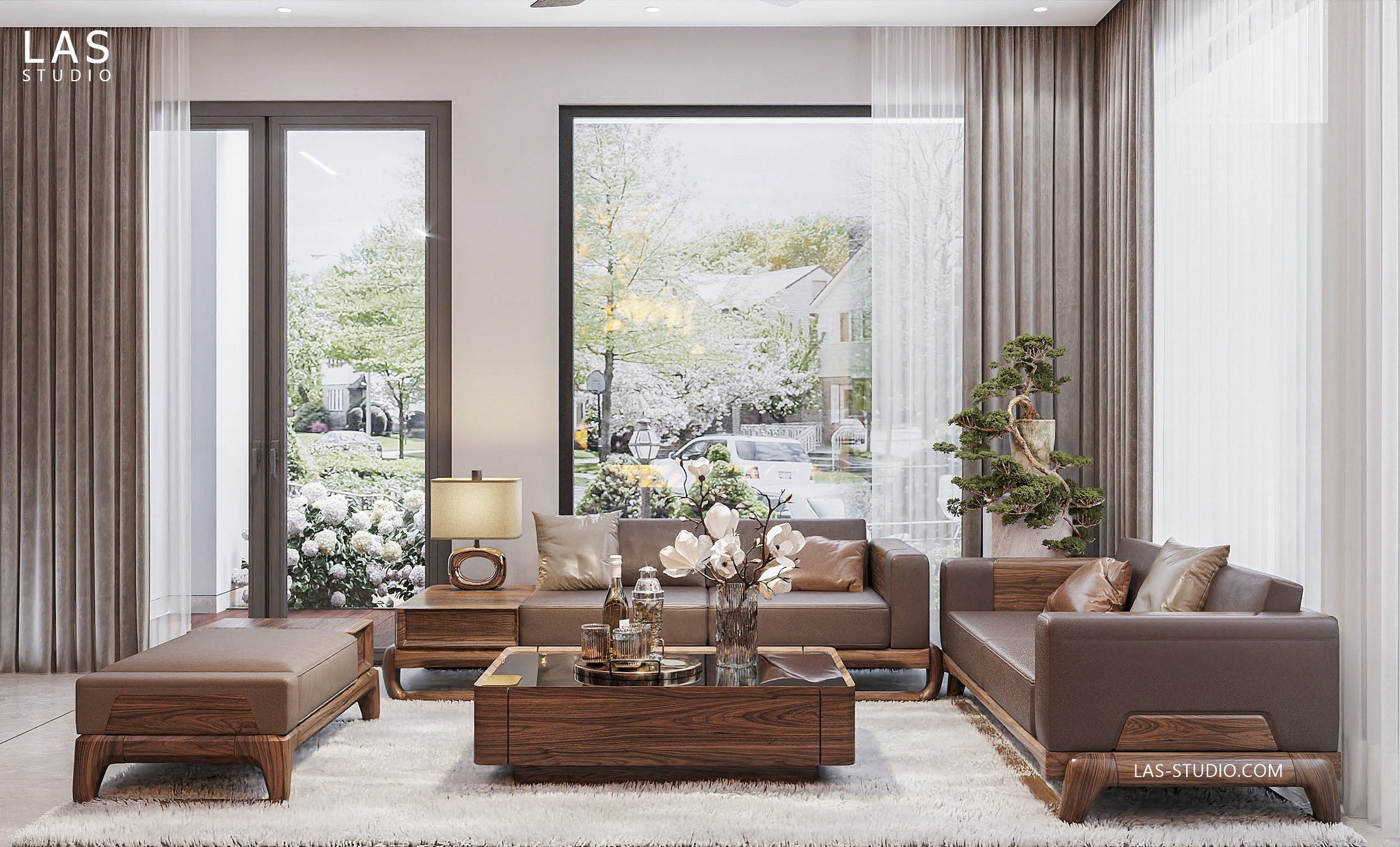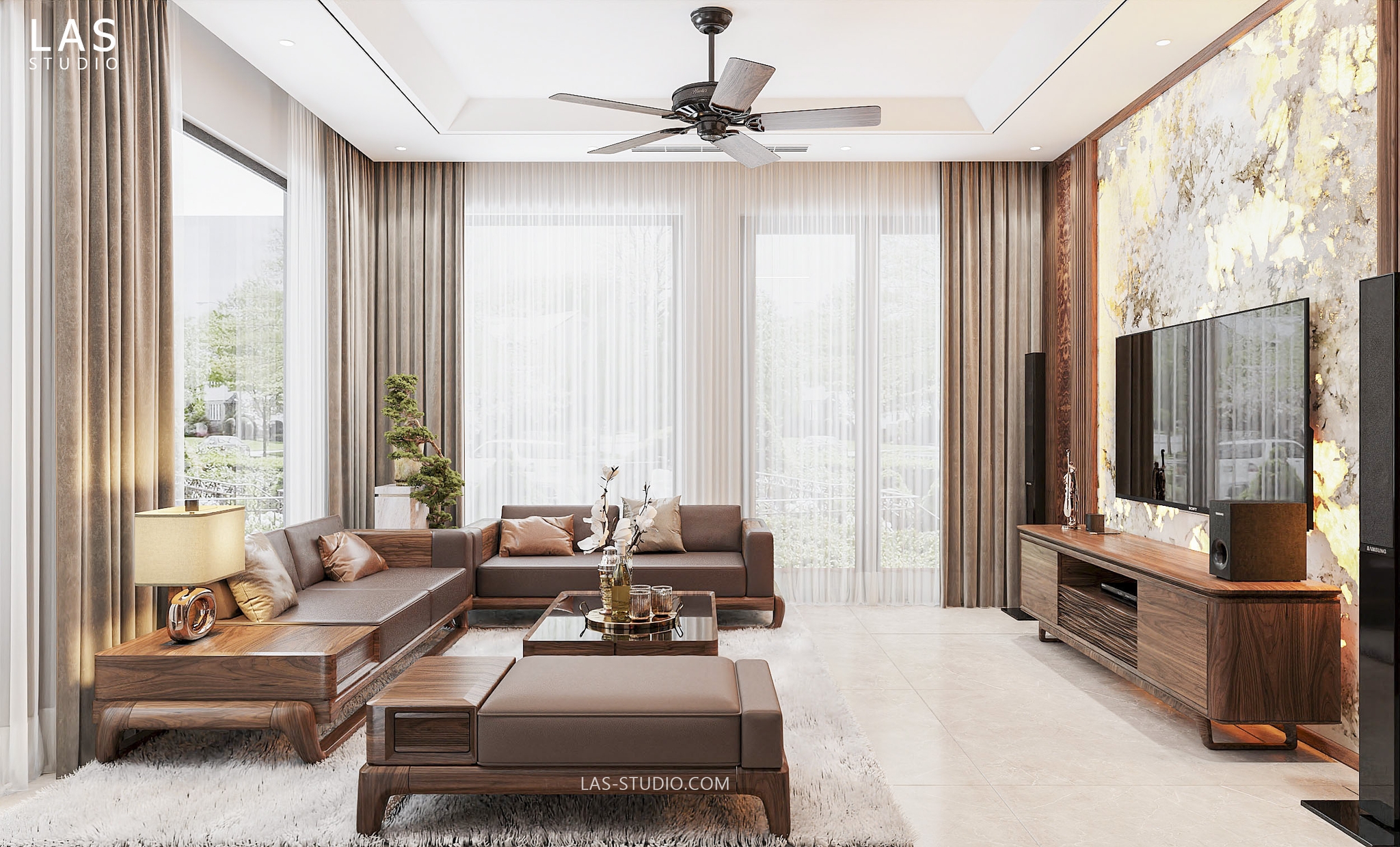 Phòng khách: Bộ sofa, bàn trà, kệ tivi làm từ gỗ óc chó tạo nên không gian tiếp khách đầy đẳng cấp.